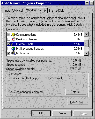 You can also open the Add/Remove Programs Properties dialog box at the Windows Setup tab by clicking Start, pointing to Settings, clicking Control Panel, double-clicking Add/Remove Programs, and then clicking the Windows Setup tab. If you used a compact disc to install Windows, you will be prompted to insert it into your computer. |